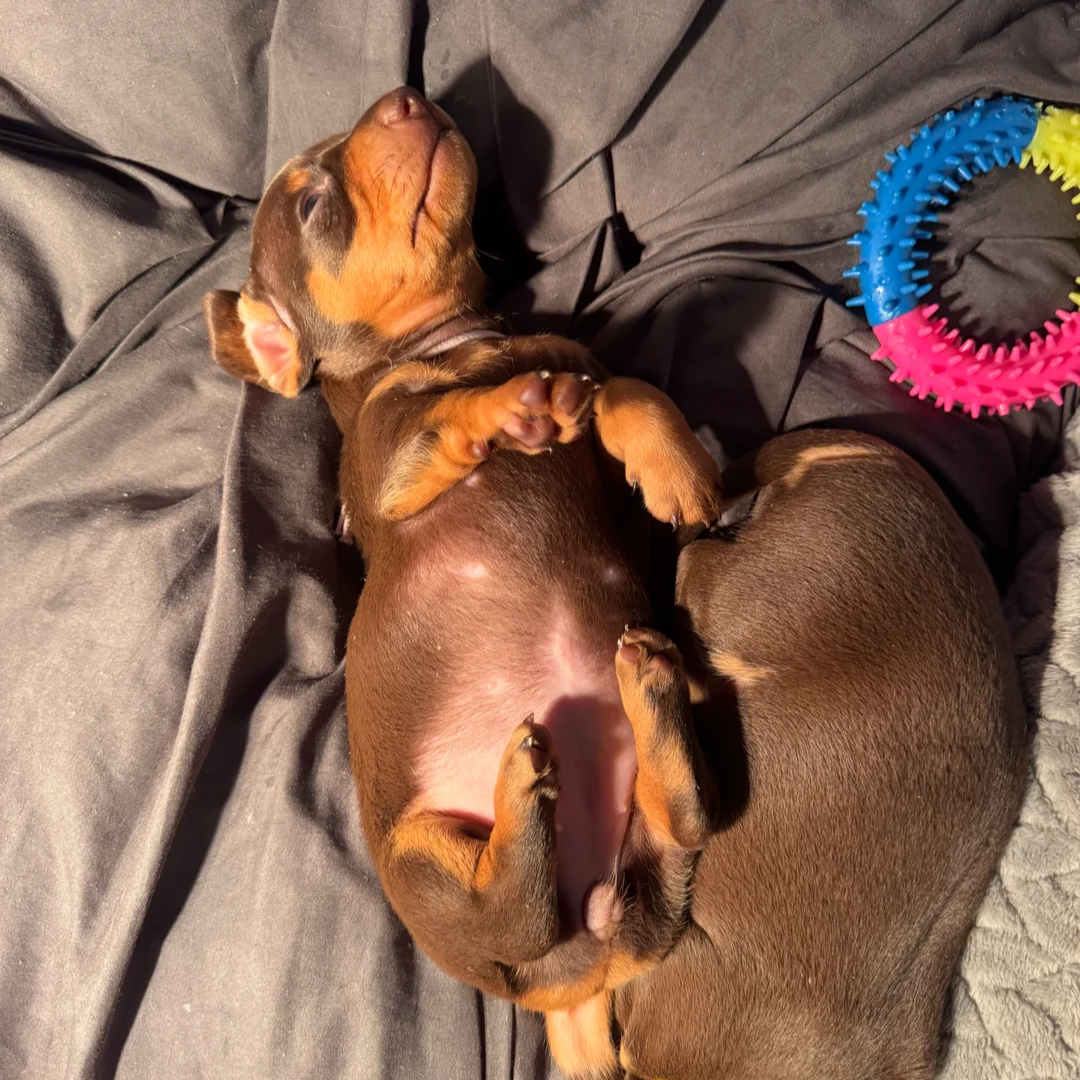 Both Coco and their sire, Ronnie are beautifully proportioned Miniature Dachshunds with classic straight toplines. They are gentle, soft-natured, full of character, incredibly loving, and independent.